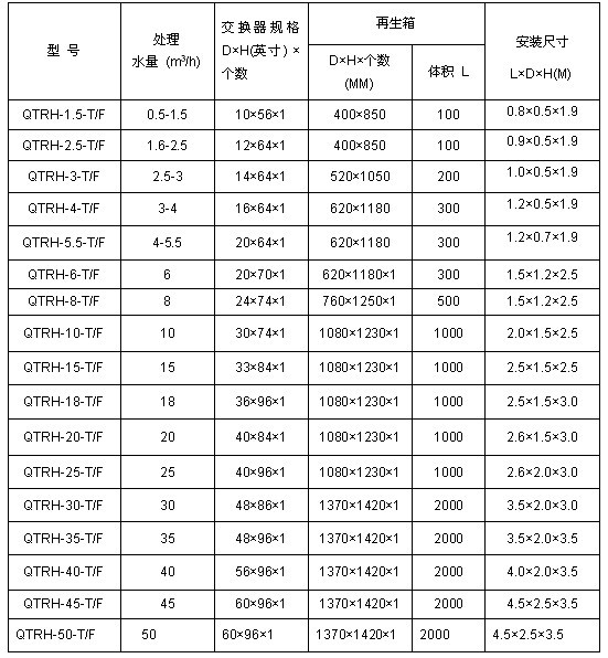 泉特软化水设备QTRH选型表: